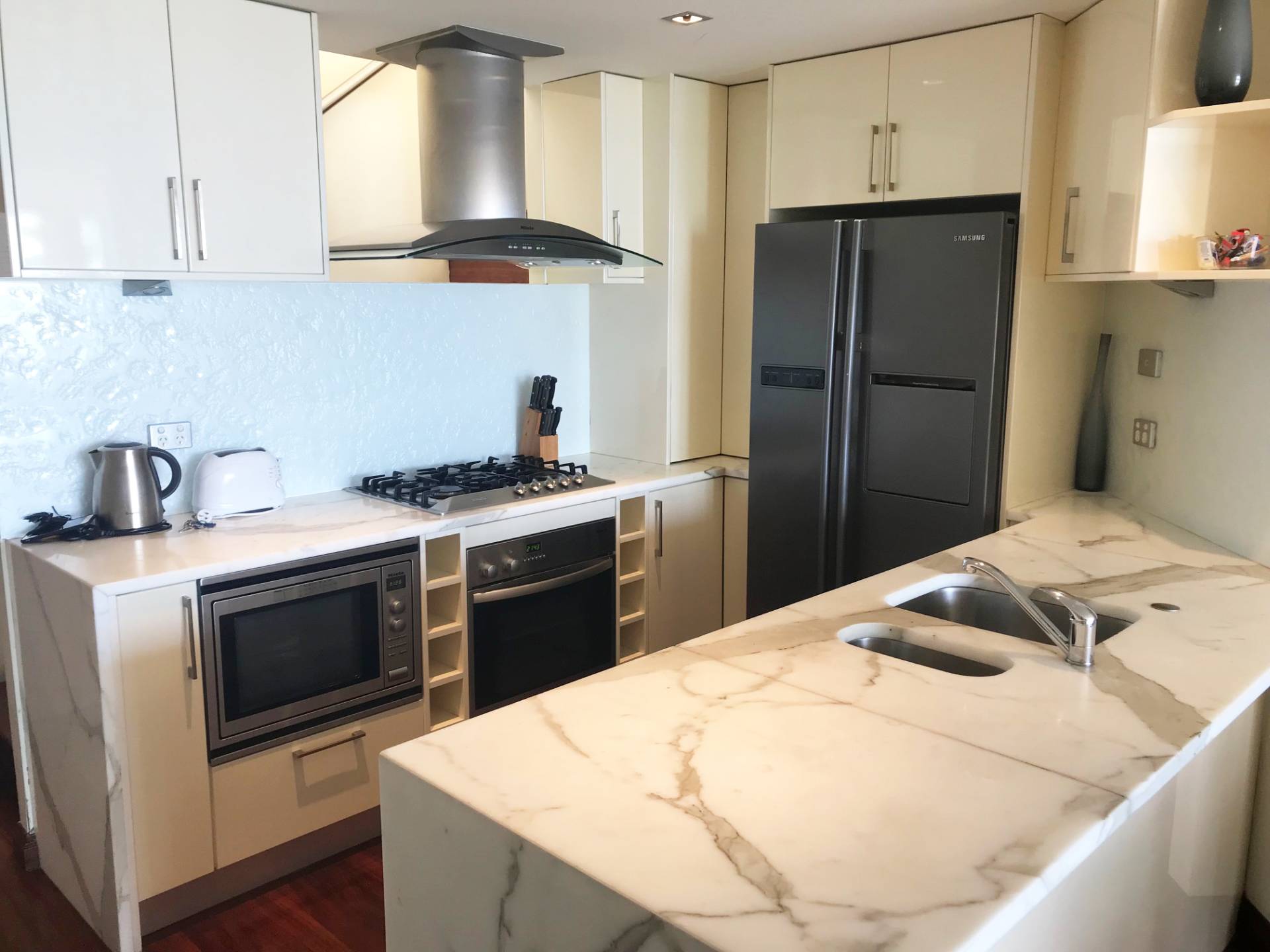 -Gourmet gas kitchen boasts stone bench tops, quality stainless Miele appliances and dishwasher