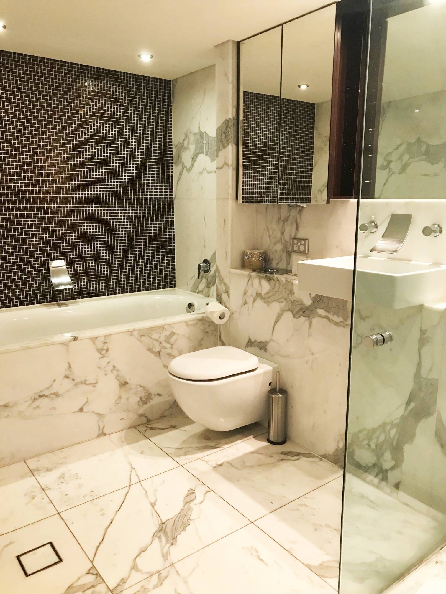-Elegant well-appointed bathrooms with marble vanity tops & floors, sleek framless glass showers, main features a bath