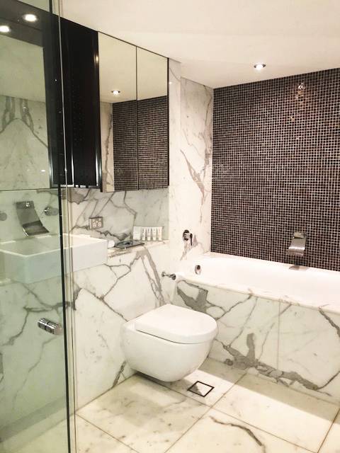 -Elegant well-appointed bathrooms with marble vanity tops & floors, sleek framless glass showers, main features a bath